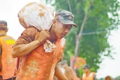 18岁的他是广西人,入伍1年多了。6日,暴雨肆虐,浑身湿透的他,背着沙袋,一趟一趟地奔波着,汗水和着雨水流。一位老奶奶拉着他的手心疼地说:“孩子呀,歇会再背。”老奶奶的话很暖心,但他知道他没有时间歇。