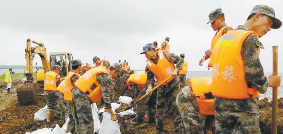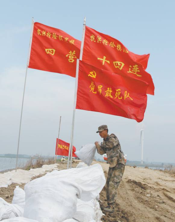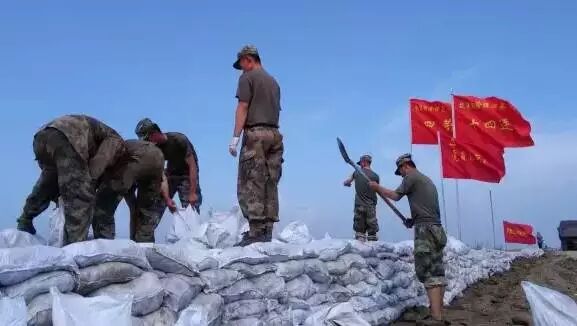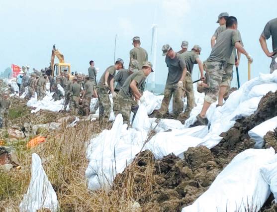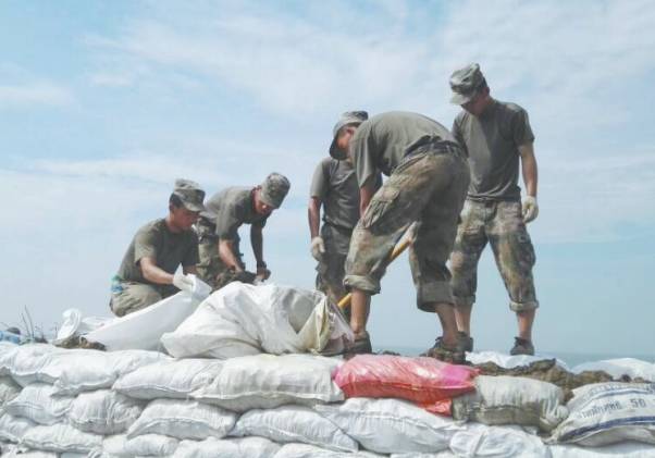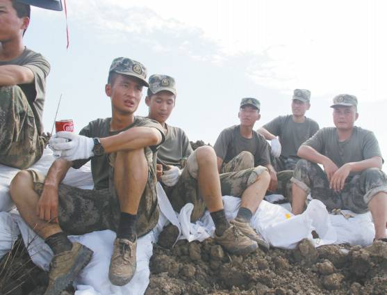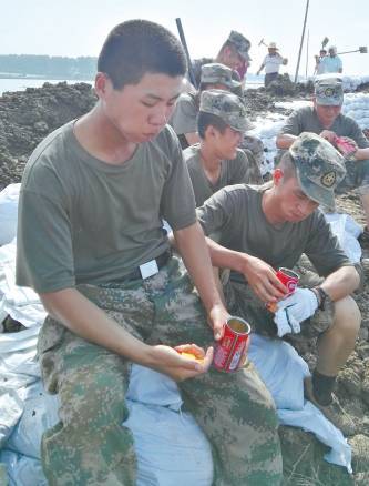 “天晴了,我们才能松口气歇会。”战士肖海波说,前几天的大雨,他和战友们顾不上休息,顾不上吃饭,争分夺秒地灌沙袋、垒沙袋。