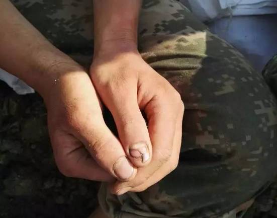 19岁的新兵黄文斌来自南昌,刚刚在堤上拼命扛沙袋的他,一放下铁锹,就和身边的战友开起了玩笑,一脸稚气。当他举着满是泥土的手擦额头上的汗水时,记者发现他左手拇指指甲盖只剩下一半,露出的肉里沾满了泥土。