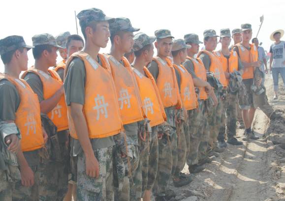“集合!”随着沙哑的号令声,20名战士穿上救生衣,赶赴另一个抢险点……
