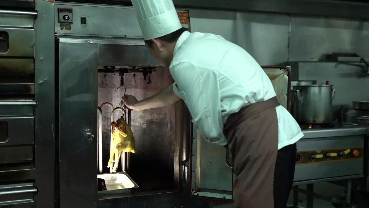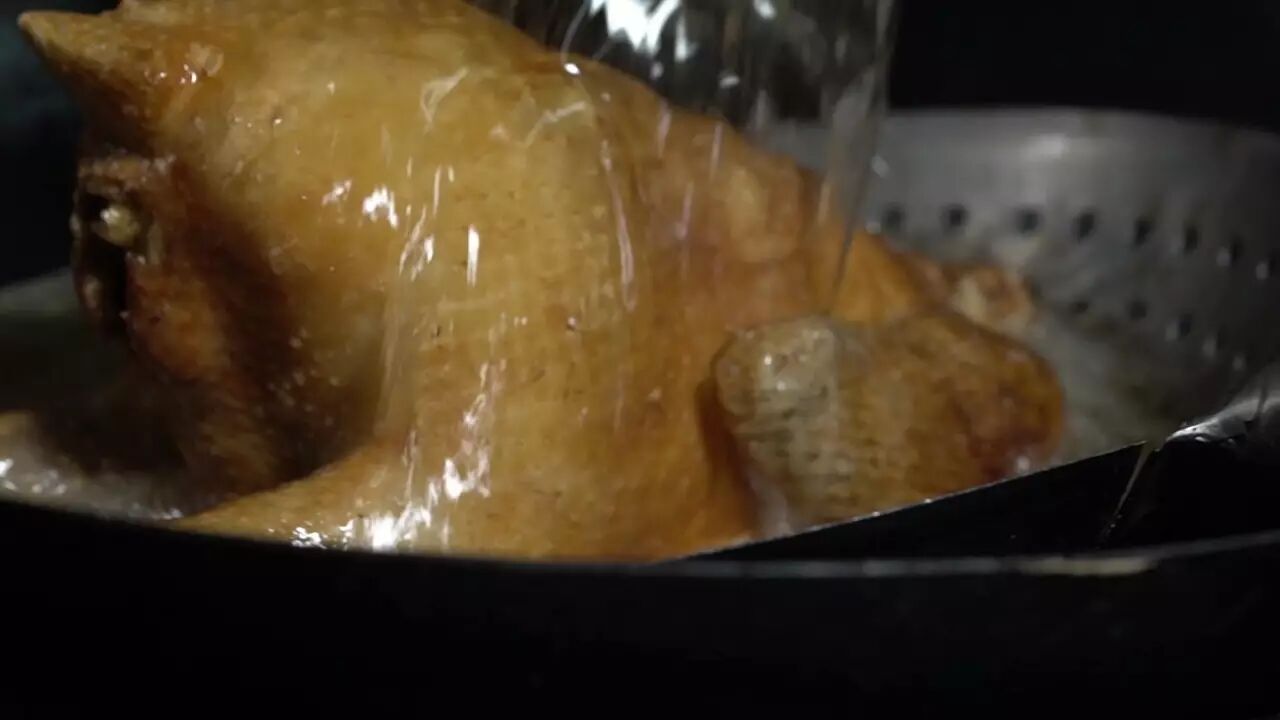 然后用烤箱250度温度烤土鸡,约25分钟至烤熟后取出;再然后用80度油温将假娄合炸熟捞出,油温升至200度,淋在烤鸡上,直至烤鸡皮变金黄酥脆。