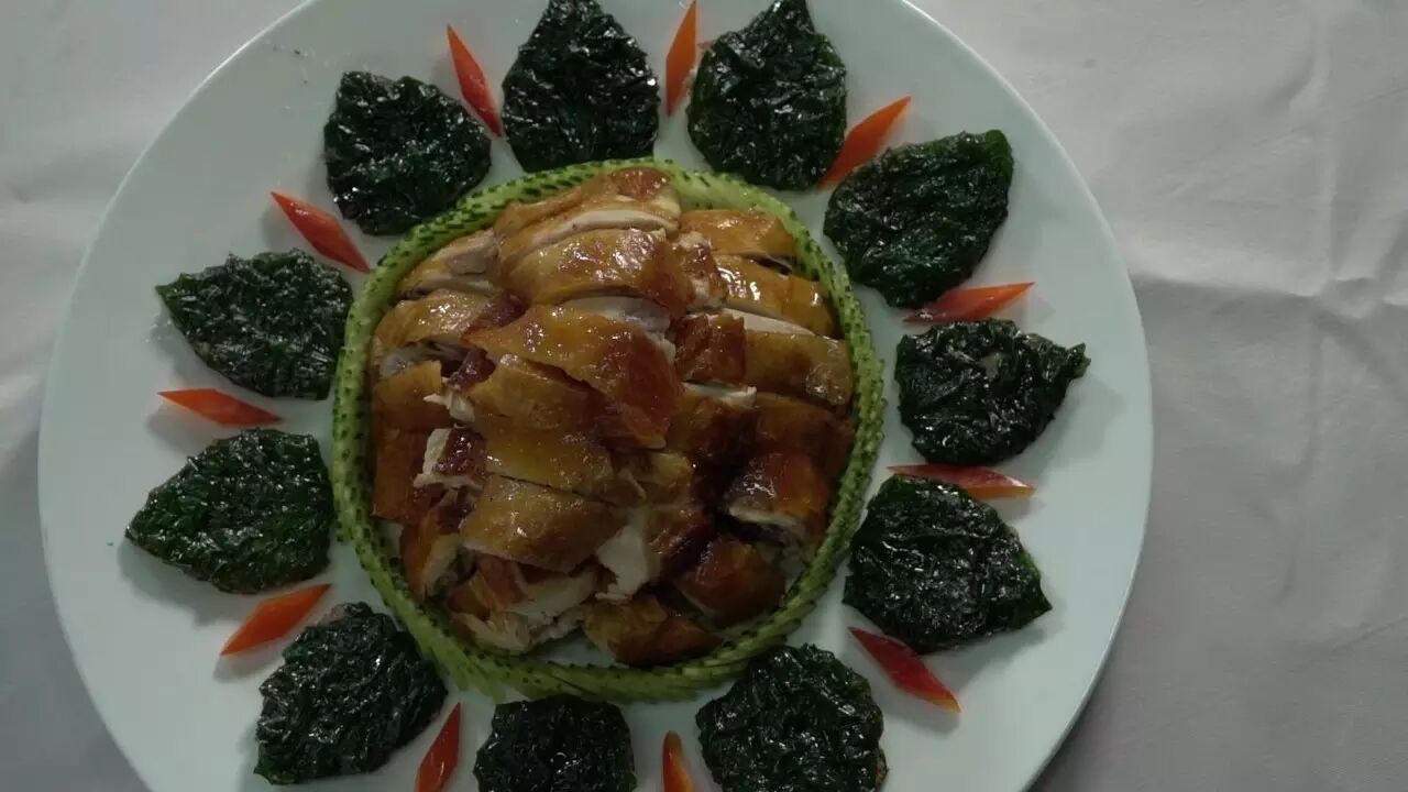 最后一步就是摆盘,将烧鸡切块摆放在盘中间,四周配上假娄合,在点缀上颜色鲜艳亮丽的蔬菜,一位秀色可餐的壮乡“角儿”登场!