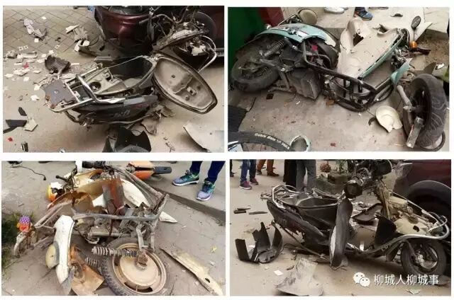 当时一辆现代朗动轿车快速冲出,将停放路边的7、8架电动车冲倒散架。(图片来源:柳城人柳城事)