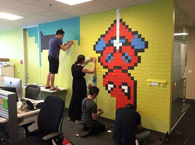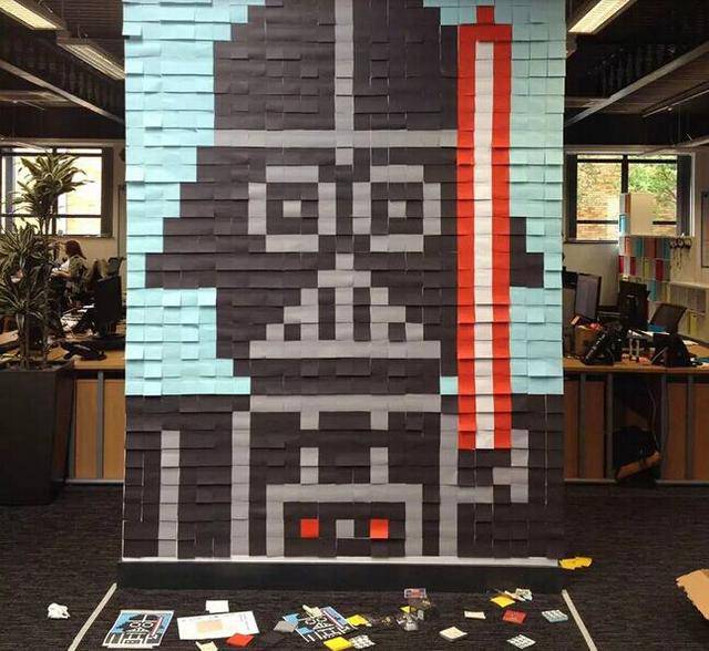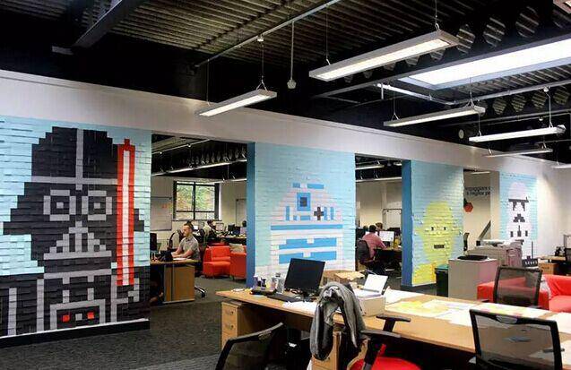最神奇的是,远在英国另外一些上班族,看到了他们的新闻,感觉这个创意很不错,他们也去买了便利贴开始装修自己的办公室。