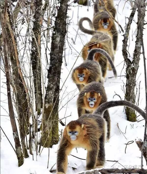 (2)一群金丝猴在神农架大龙潭金丝猴保护基地的树林中行走(2016年1月13日摄)。
