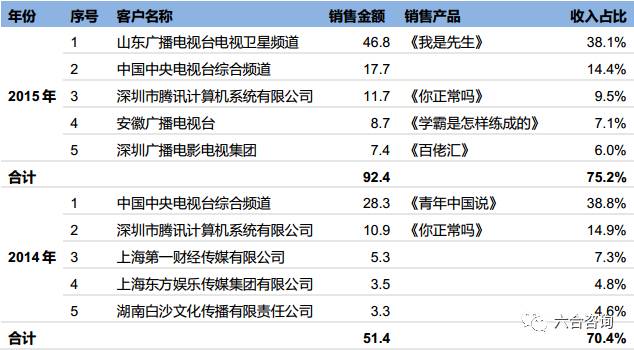 公司拥有多元化发行、推广渠道,与各类播出平台长期稳定合作。目前与公司密切合作的包括腾讯视频、优酷土豆、爱奇艺、乐视视频等4家主流视频网站,央视、东方卫视、江苏卫视、安徽卫视、东南卫视、深圳卫视、广西卫视、山东卫视、河北卫视、宁夏卫视、炫动卡通卫视等10、省级卫视,上海教育台、上海艺术人文频道等2家地面频道。
