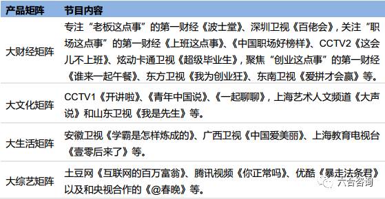 公司4大原创产品矩阵均有代表性栏目。大财经矩阵:《波士堂》、《爱拼才会赢》等。大文化矩阵:《开讲啦》等。大生活矩阵:《壹零后来了》、《我是先生》等。大综艺矩阵:《你正常吗》、《暴走法条君》和网生产品、大型户外真人秀、演播室综艺栏目等。