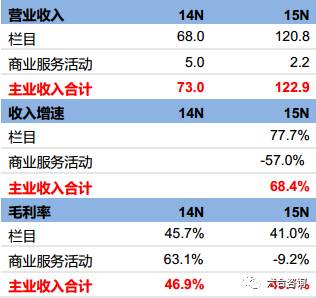 栏目:公司以4大产品矩阵为核心竞争力,栏目占公司总收入90%以上,2014~2015年该业务收入分别为0.68亿、1.21亿(+77.6%),毛利率分别为45.7%、41.0%。
