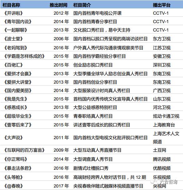 公司把握行业趋势,积极发力大综艺,战略布局互联网网生、综艺类型栏目,打造精品化网生内容。公司已制作多部爆款节目,包括与土豆网合作大型真人秀节目《互联网的百万富翁》(2009年),与腾讯视频合作大型调查真人秀《你正常吗》(2014年),与优酷网合作吐槽脱口秀《暴走法条君》(2016年),与乐视视频合作财经类重磅话题栏目《头等舱》(2016年),以及结合2017鸡年春晚与央视网合作《@春晚》等。