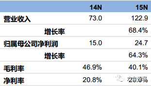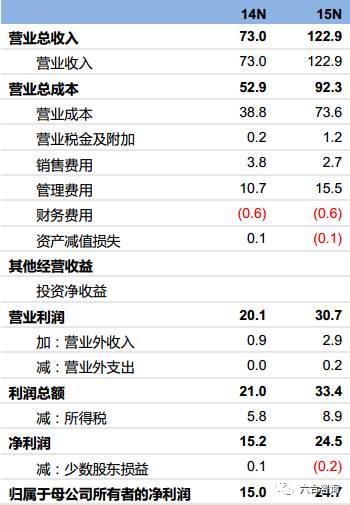总收入:2014~2015年分别为0.73亿、1.23亿(+68.4%)。