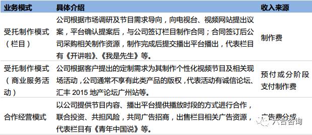 公司是专业的栏目制作及运营企业,主要从事栏目的投资、策划、制作、发行和相关商务运营,以及针对客户需求提供定制化服务内容,产品主要涵盖栏目和商业服务活动。公司拥有财经、文化、生活、综艺4大矩阵产品,同时承办大型商业服务活动,与央视、山东卫视、优酷土豆、腾讯视频等国内一线媒体平台密切合作,具备多元化的节目制作和发行渠道。