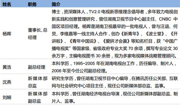 公司管理层在湖南广电拥有丰富的从业经验和扎实的行业理论知识,助力公司发展、适应行业变化。公司创始人杨晖2006年首次提出TV2.0电视新思维理念,将电视栏目从单一电视产品改造成全媒体与观众互动的产品,通过微博、微信、视频网站等新媒体平台营销,在出版、音频等领域开发衍生品,与观众形成强烈互动的全媒体整合产品,实现优质内容资源价值最大化。