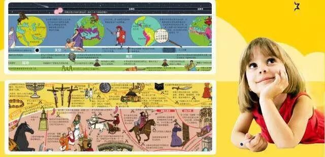 孩子可以按照某个时间点,看一个地区发生了哪些事。在下方是时间线,从宇宙大爆炸到2015年。在上方,不同颜色表示不同的范围,如宇宙、地球、海洋、陆地、亚洲、欧洲、中东,美洲,非洲等等。
