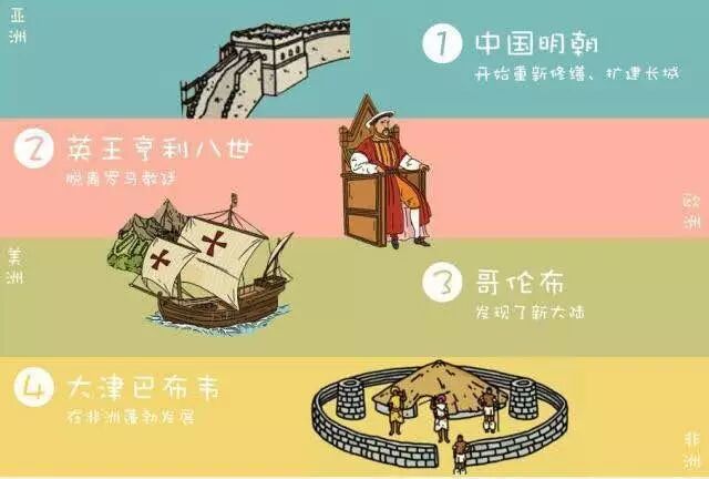 竖着来看,你会发现很多大事件,当中国明朝正在修建长城抵御北方民族的时候,哥伦布发现了美洲大陆,英王亨利八世脱离罗马教廷,波兰学者尼古拉斯·哥白尼提出地球围绕太阳运行的日心说……