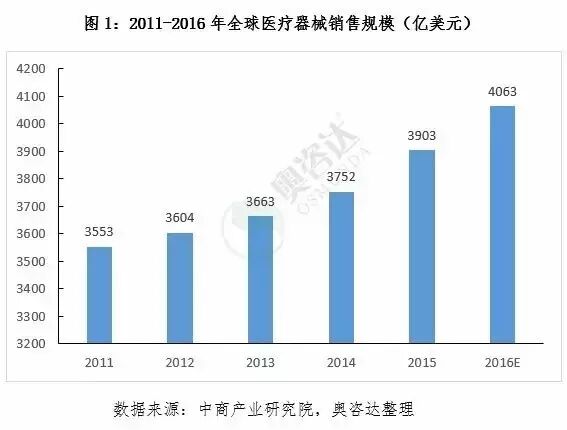 根据EvaluateMedTech的统计,2015年全球医疗器械销售规模为3903亿美元,2011-2015年全球医疗器械销售规模稳步增长,复合增长率为1.90%。基于120家医疗器械行业内领先公司的数据测算,2015~2020年世界医疗器械产业复合年均增长率将达到5%,到2020年市场规模达到5140亿美元。根据此增速测算,2016年全球医疗器械销售规模为4063亿美元。