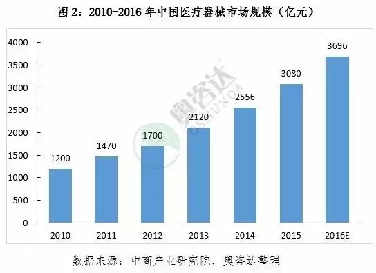 中国医疗器械产业的发展令世界瞩目。尤其是进入21世纪以来,产业整体步入高速增长阶段,销售总规模从2001年的179亿元,到2014年约合2556亿元,增长了14.28倍,国内医疗器械市场规模大大高于全球增速,成为仅次于美国的全球第二大医疗器械市场。我国医疗器械2015年市场总规模约为3080亿元,2015-2020年医疗器械市场将保持20%的增速。根据此增速测算,2016年中国医疗器械销售规模为3696亿元。