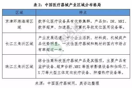 随着我国医疗器械产业的发展,全国已形成了几个医疗器械产业聚集区和制造业发展带,珠江三角洲、长江三角洲及京津环渤海湾三大区域成为本土三大医疗器械产业聚集区。据不完全统计,三大区域医疗器械总产值之和及销售额之和均占全国总量的80%以上。因为各区域自身所具有的条件不同,这三大产业聚集区又呈现出明显的地域特点。中国医疗器械产业的区域分布格局如下表: