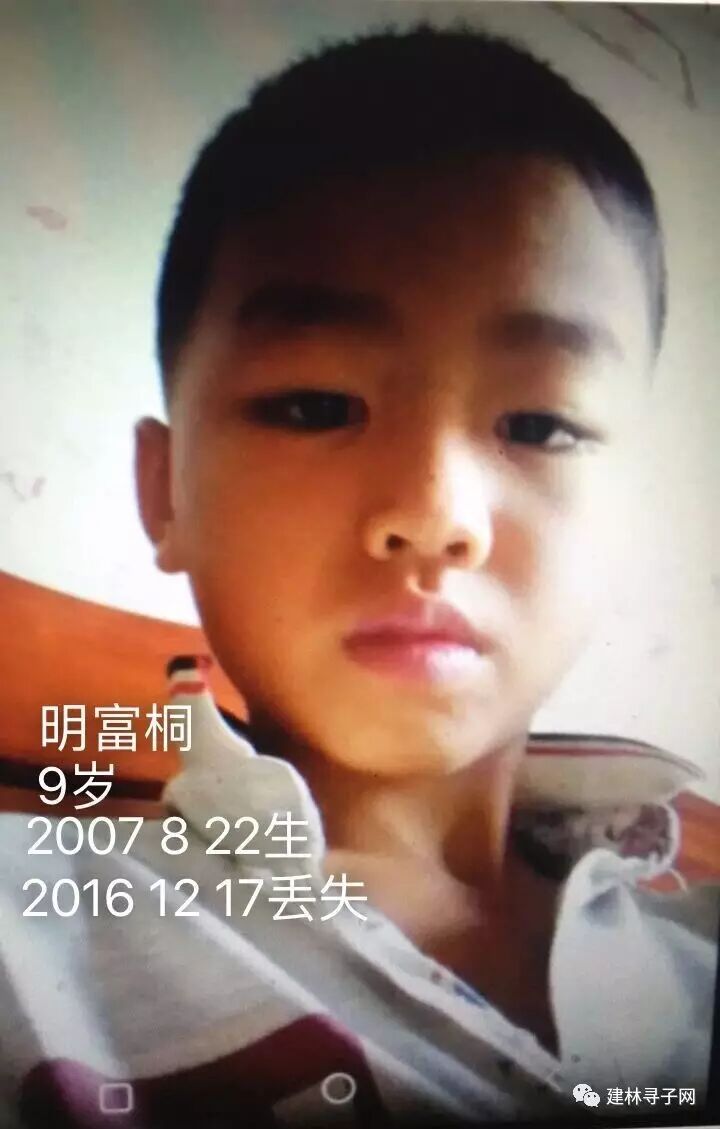 明富桐于2016年12月17日上午十一点三十分在三岔村走失。至今未见回家,家人找得着。当时小孩身上穿着灰黄色外套,黄色裤子,黑色鞋子,小孩能说出家庭地址、家人名字、爸爸以及家人的手机号码。爸爸 : 明达枢 妈妈 姐姐明美娥,哥哥明富演。
