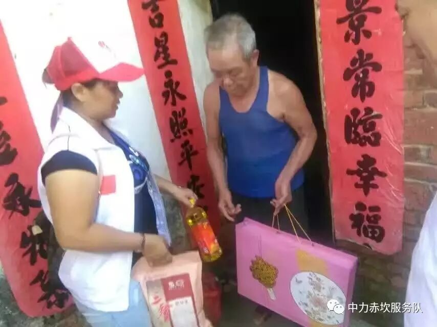 中力赤坎服务队的志愿者分别到调顺、北桥街道的五保特困户,孤儿,送去了月饼等一批生活必备品和为他们送上中秋的祝福!