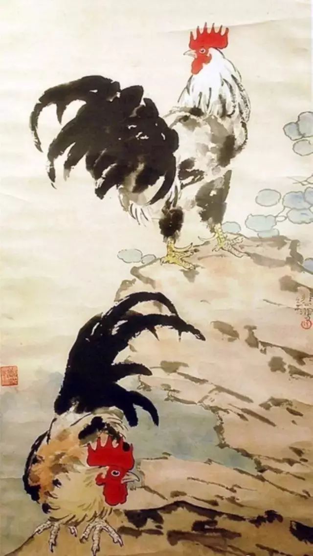 徐悲鸿作画,不论画马、画鸡或其它动物,都有所寄托,有所寓意。他笔下的鸡,多是昂首挺立、怒发冲冠的公鸡。公鸡正是英勇、顽强的象征。徐悲鸿正是想通过画鸡来赞颂中国人民不屈不挠的民族精神,同时也表达对和平的祈求。