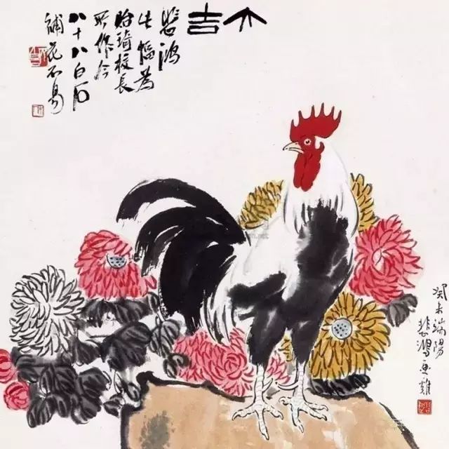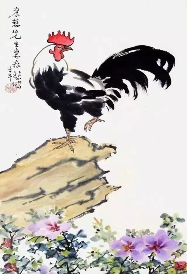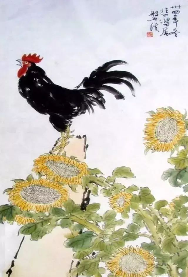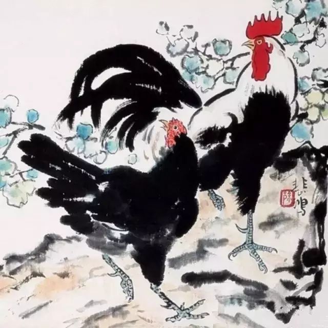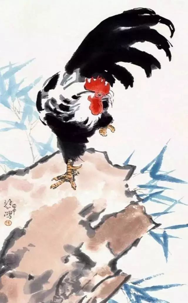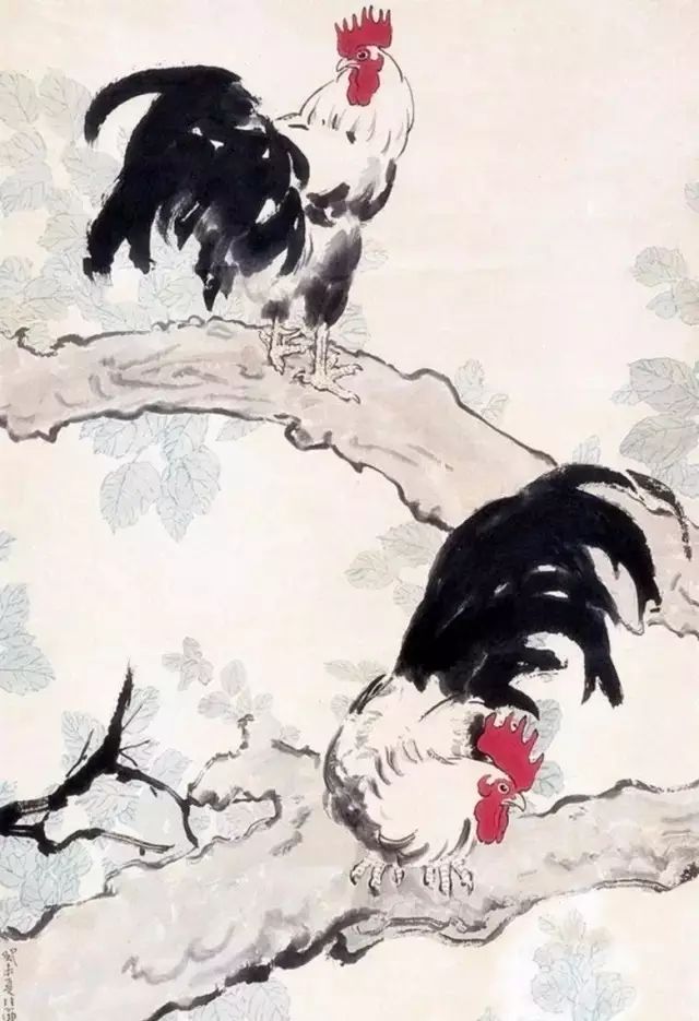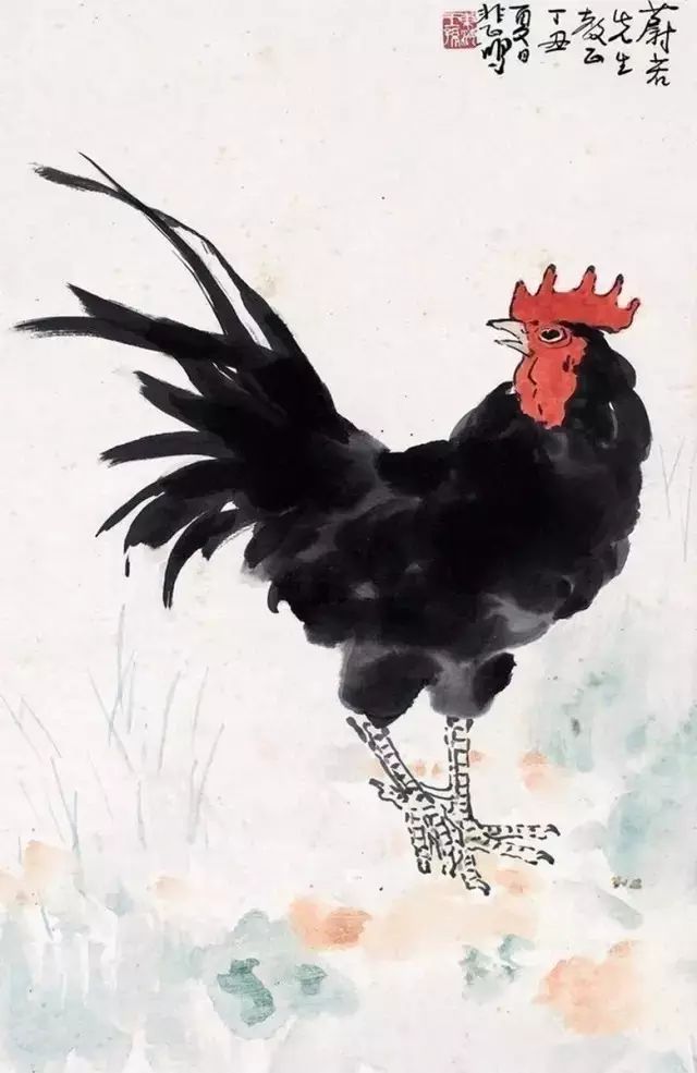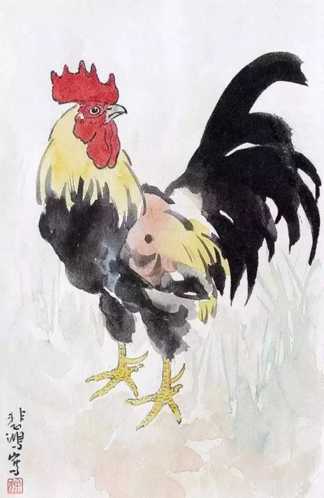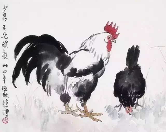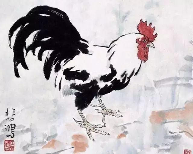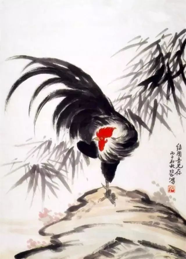 徐悲鸿笔下的鸡,造型极为写实,尤其冠与爪之刻画,笔法精细严谨,尾巴以浓墨大笔扫出,冠红如火,尾黑如漆,在粗与细,红与黑的对比中呈现出一种和谐。