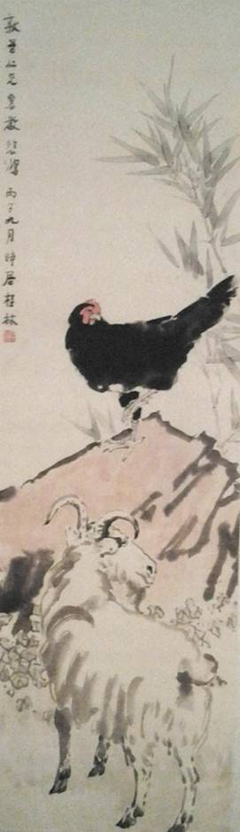《鸡羊图》由徐悲鸿1936年9月创作于广西。画面上,一只黑色的鸡与一只白色的羊相顾对视,左上方题有“敦吾仁兄惠教悲鸿”。画作的受赠人易敦吾早年任梧州医院院长,是广西卫生界的名家,与徐悲鸿过从甚密,而其兄长易钦吾与徐悲鸿更有同窗之谊。