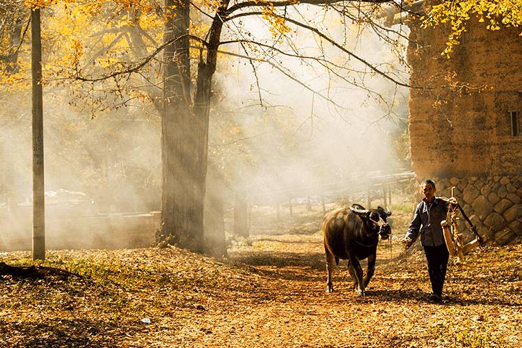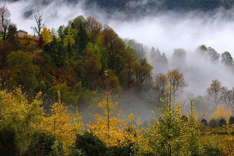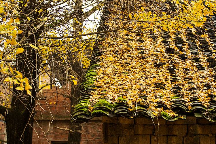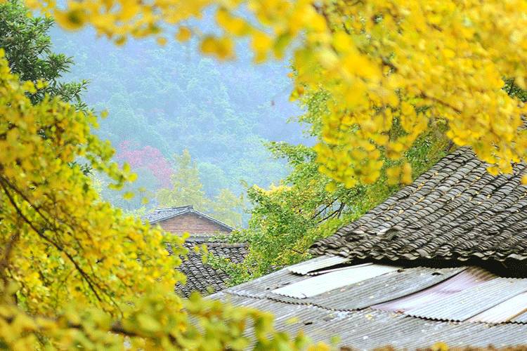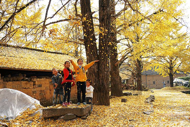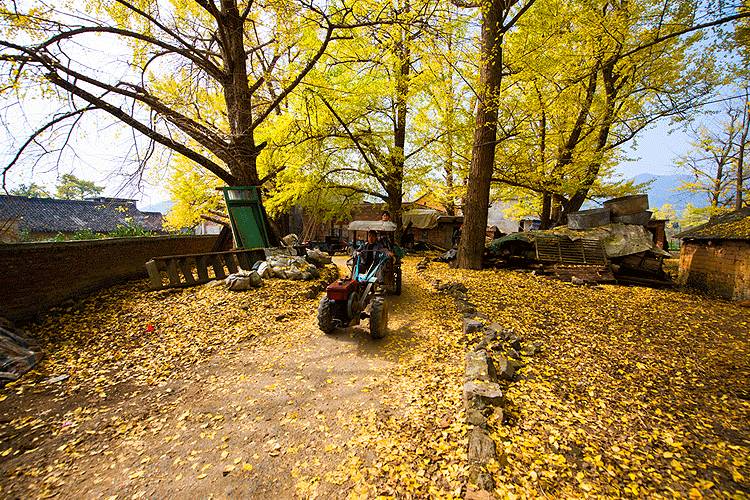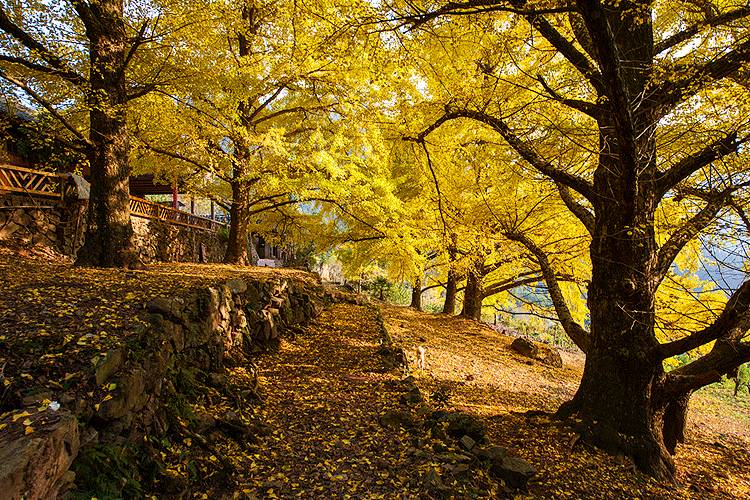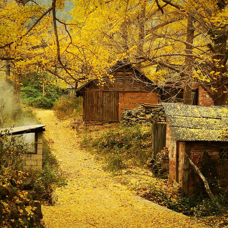 不仅如此,你还会发现成片的银杏树更像一群迁徙的动物,浩茫连绵地沿着海洋山脉密布于路旁、溪边、村落、山脚,方圆百里都是它们金黄的身影。每有秋风过处,银杏树的叶子便铺满地面,像黄金一样耀眼。
