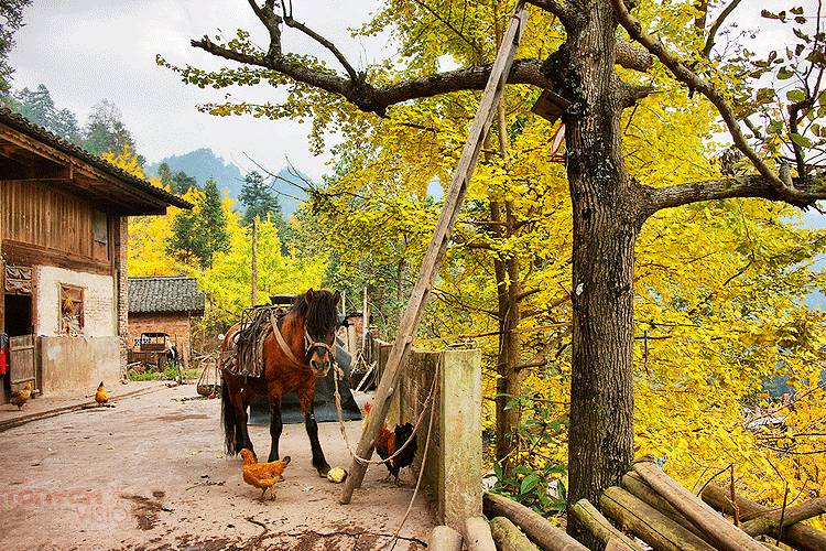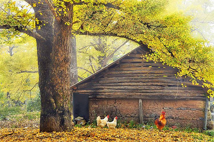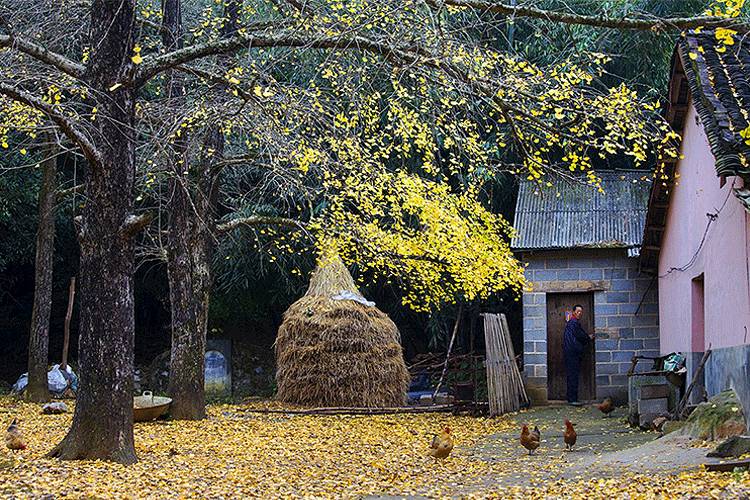 走进村子,站在银杏叶铺满的地坪上,门前的田里时不时会走出来肤色靓丽的鸭群,还有屋后不远处的山头,厚厚的一层银杏叶下,会钻出来几只气宇轩昂的大公鸡。