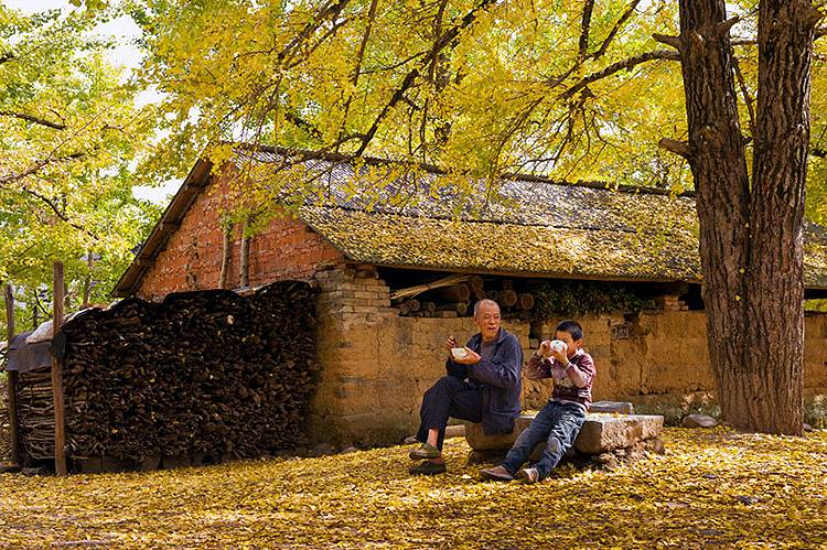 曾有人问我,幸福是什么模样?我想起了另外一张老照片,照片里一个老者和一个小孩正坐在银杏树下吃饭,小孩吃得山响,老者笑得灿烂,当那黄灿灿的银杏叶飘落下来时,老者对小孩说:“饭得一口一口吃,路得一步一步走,别太心急咯!”