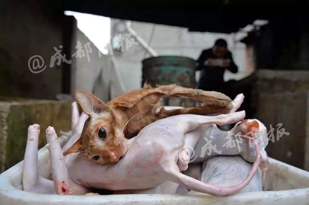 根据黄平富的描述,杀猫的过程十分残忍。“杀猫人将猫装在一个麻布袋中,一口袋一口袋放进水中淹死,接着开始放血,剥皮。每天都杀,平均一天要杀一百只,杀了就拿到冻库。