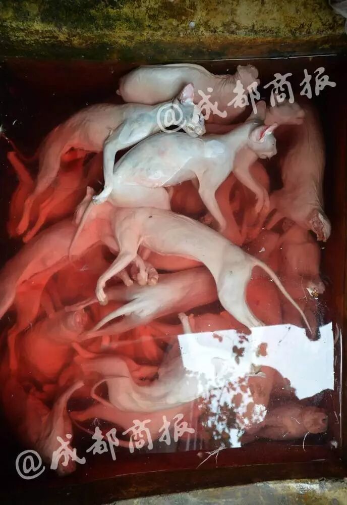在新都区斑竹园镇顺江村的杀猫作坊,执法人员一打开铁门,黄平富和杀猫的工人都在,灶台的火还燃着,几十只已经杀好的猫浸泡在血水中,去毛机内放了四只正在去毛的的猫,地上有两只浑身湿润刚被水淹死的猫,旁边堆放了几个麻袋。执法人员将麻袋打开,发现了19只活猫,大多猫脖子上都有项圈,“应该是被偷的宠物猫”。