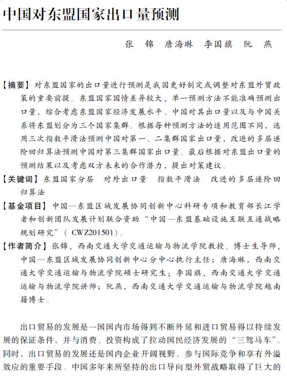 Authors Zhang Jin, Professor and Doctorial Tutor, School of Transportation and Logistics of Southwest Jiaotong University, Executive Director at the branch center of China-ASEAN Collaborative Innovation Center for Regional Development. Tang Hailin, Postgraduate for master’s Degree, School of Transportation and Logistics of Southwest Jiaotong University .