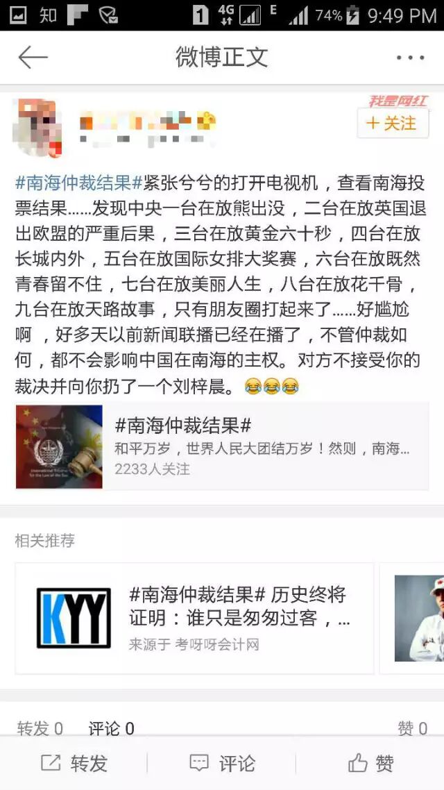 国家主权问题,我大天朝以及大天朝的子民是坚决不会低头的。不过,爱国归爱国,在吐槽的同时不要失去了理智。咱祖国还没说啥呢,我们这些子民们就先淡定啦~我们的目的是维护祖国应有的权益,切勿爱屋及乌殃及无辜,伤害了自己同根生的同胞们。