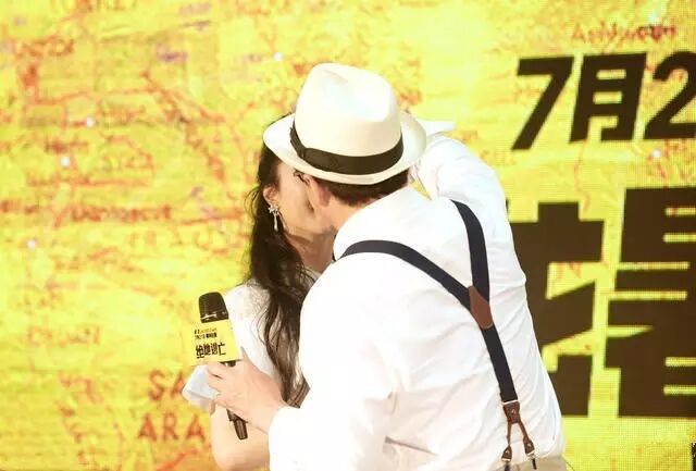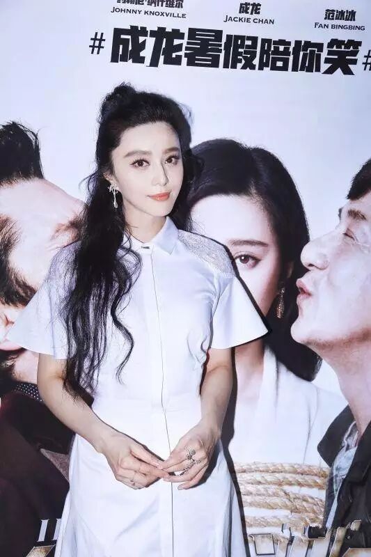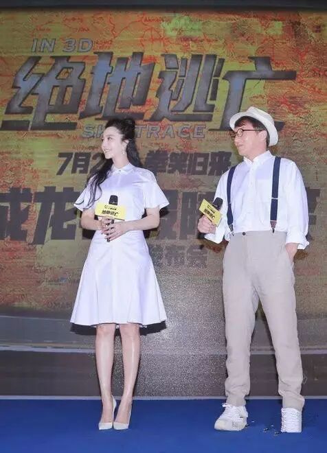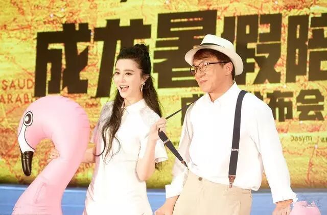 而后冰冰更是淘气地揪着成龙大哥的背带亲密合影。