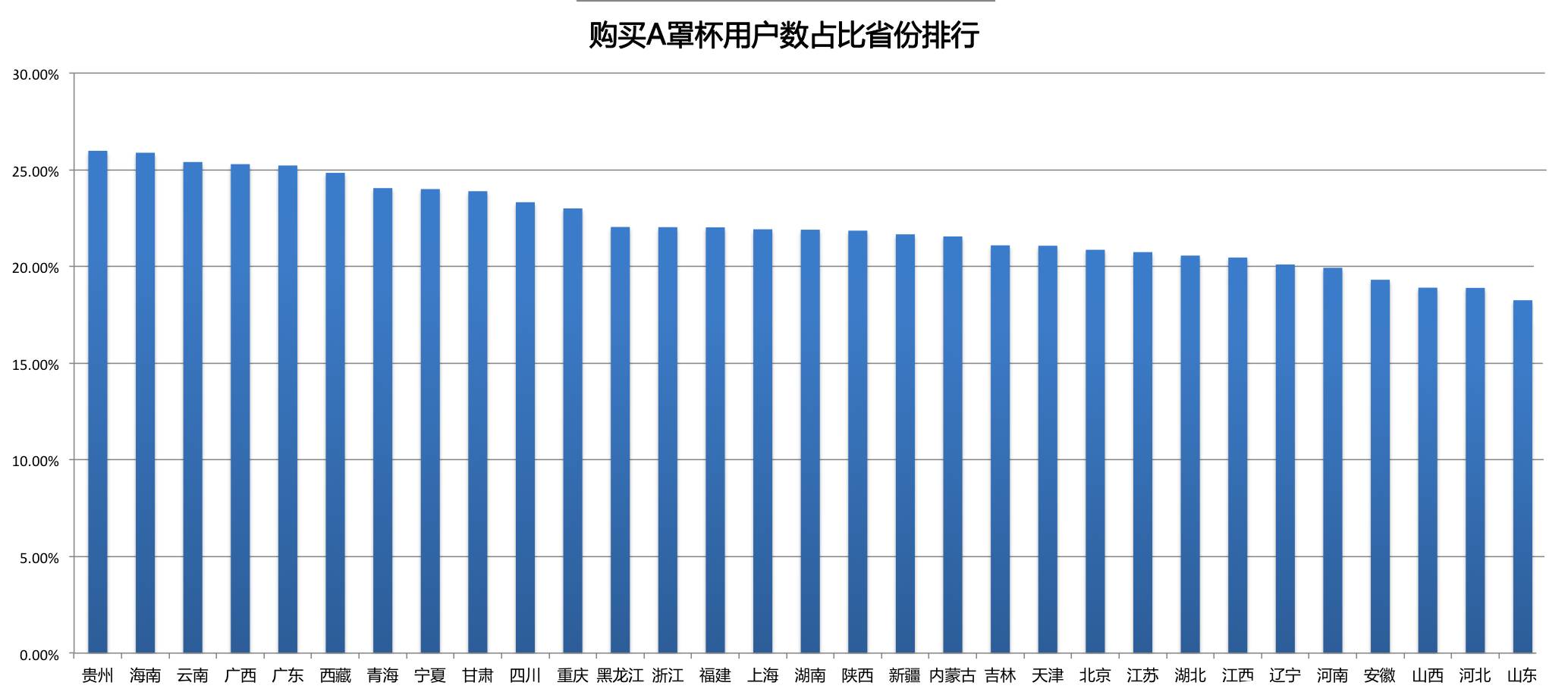 从数据来看,购买A罩杯占比最高的省份,前五甲是贵州、海南、云南、广西、广东。南方妹子不服气:伦家是小巧可爱的萝莉,贫乳才符合萌萌哒的形象。你家女友是乖巧软萌的南方姑娘还是率真迷人的北方女汉子?