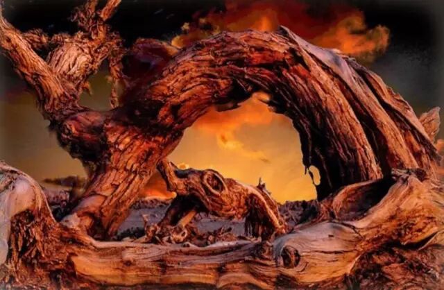 千年不死,千年不倒,千年不朽的胡杨!这三千年的树根,在霞光中更显苍桑刚劲!