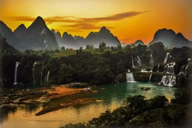 广西德天瀑布。曾记得一首歌“我住江之头,君住江之尾,彼此情无限,同饮一江水。”———对岸就是越南。