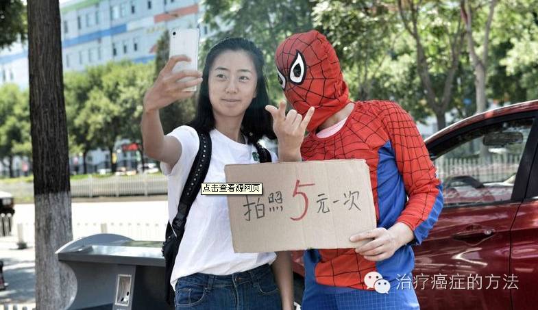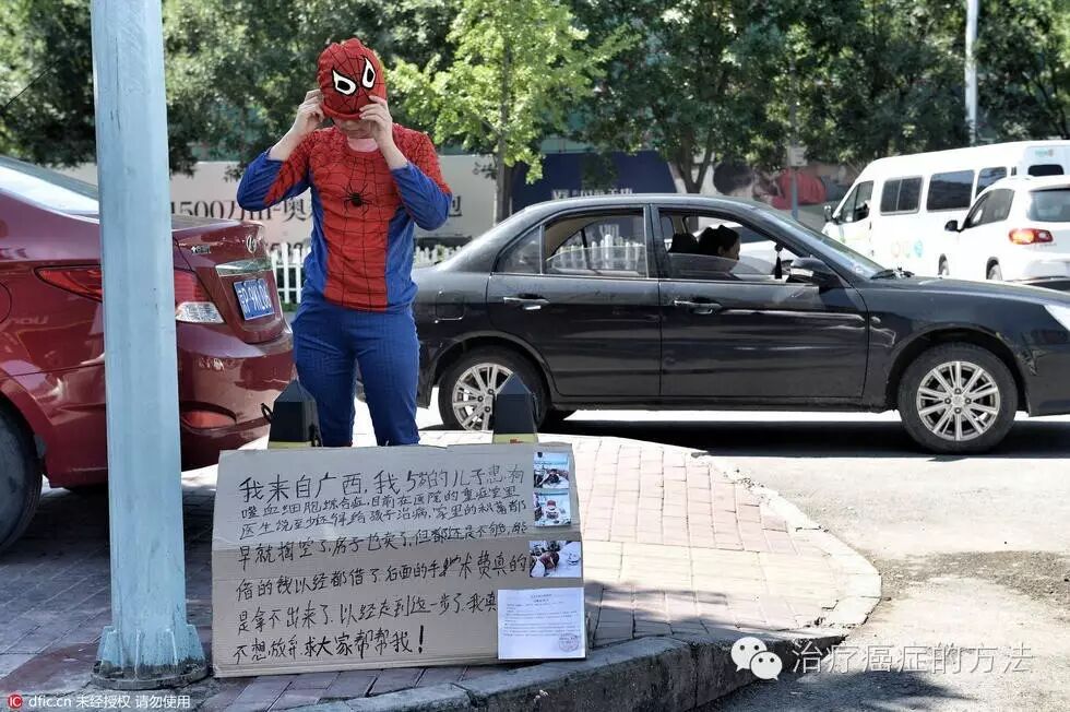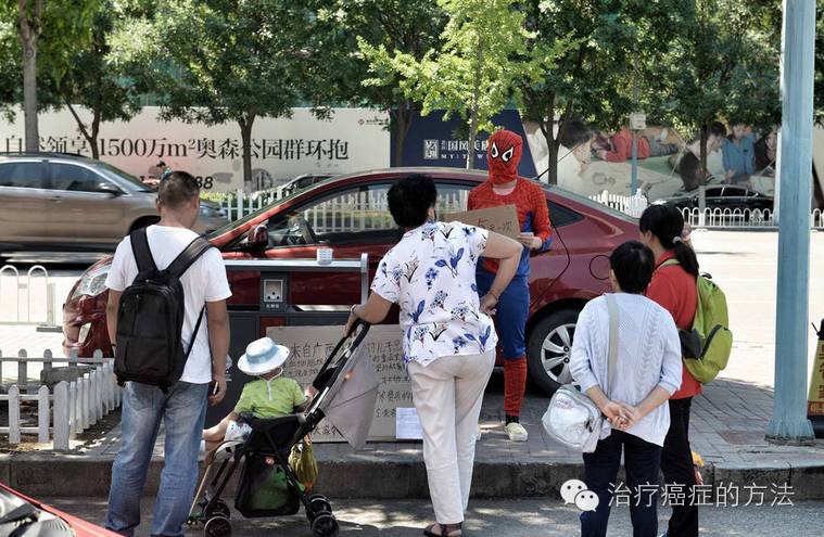 2016年6月15日上午9点多,北京昌平区回龙观东大街附近,来自广西桂平的何女士面戴头罩,当街扮演“蜘蛛侠”,举牌求路人拍照,为身患噬血细胞综合症的5岁半儿子小威(化名)筹钱治疗,引来路人驻足围观。