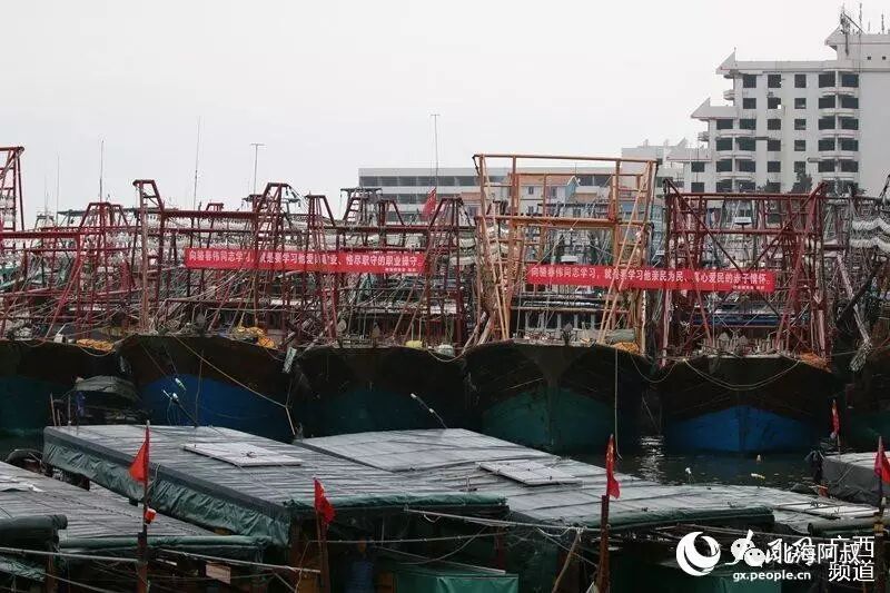 图为渔港内悬挂起的向骆春伟烈士学习的横幅(义挚/摄)