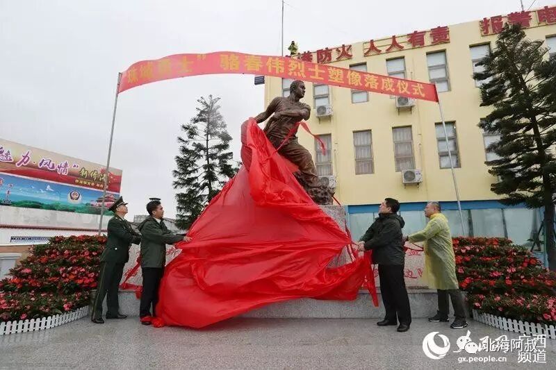 英雄壮举浩气长存,不朽丰碑万古流芳。3月25日,“珠城勇士”骆春伟烈士塑像在广西北海市侨港镇半岛路渔民活动中心南侧落成,这是该市首尊英雄人物塑像。广西北海市委书记王乃学、北海市市长李延强、,边防官兵、、干部、群众、学生及烈士家属代表共110人出席落成仪式。仪式由北海市副市长、。