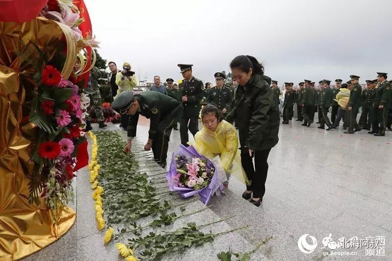 图为边防官兵与群众一起,为烈士献花,缅怀烈士