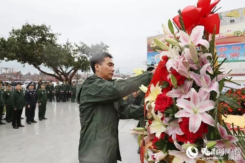 图为北海市委书记王乃学仔细整理花篮缎带(义挚/摄)