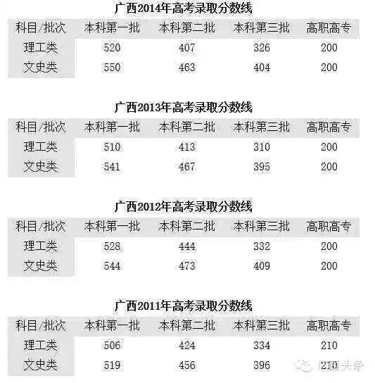 广西2015年普通高校招生录取最低控制分数线划分如下: