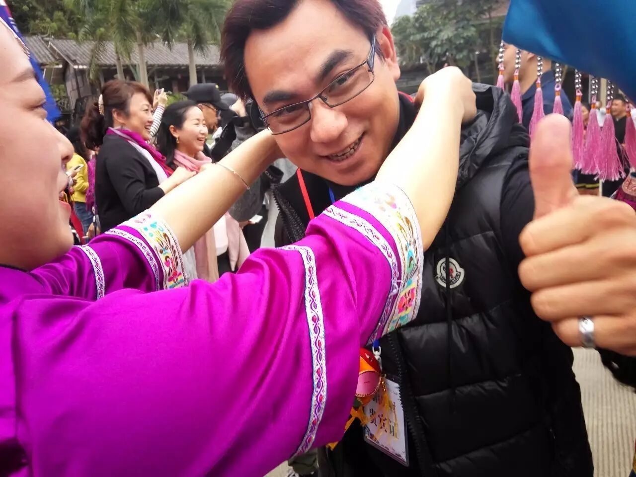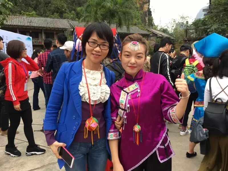 △978玉林城市电台的总监姚驰带上绣球后和漂亮的壮家妹妹合影留念