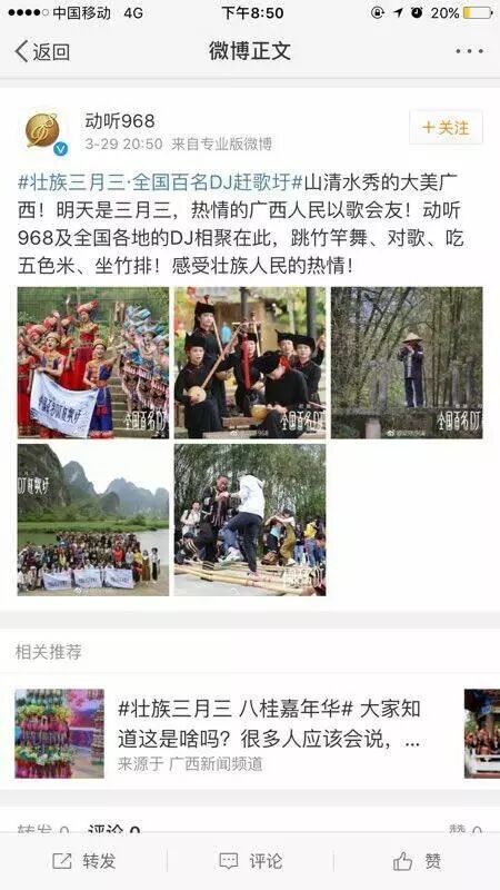 3月28日到3月30日,正值“壮族三月三”传统歌节,、广西人民广播电台主办,FM950广西音乐台联合全国各广播媒体、网络新媒体举办的全国性、全媒体大型采访活动“壮族三月三•全国百名DJ赶歌圩”。