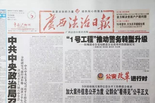 7月27日,《广西法治日报》在头版头条刊登题为:,“1号工程”以来取得的成效。