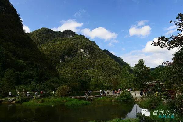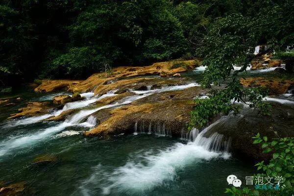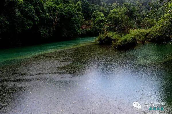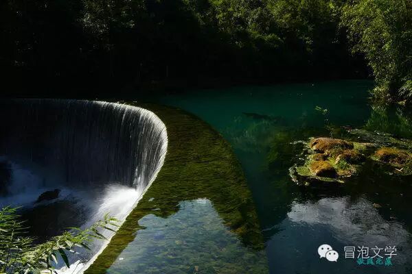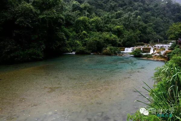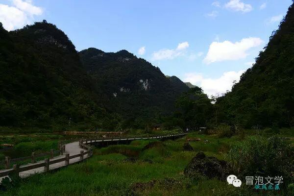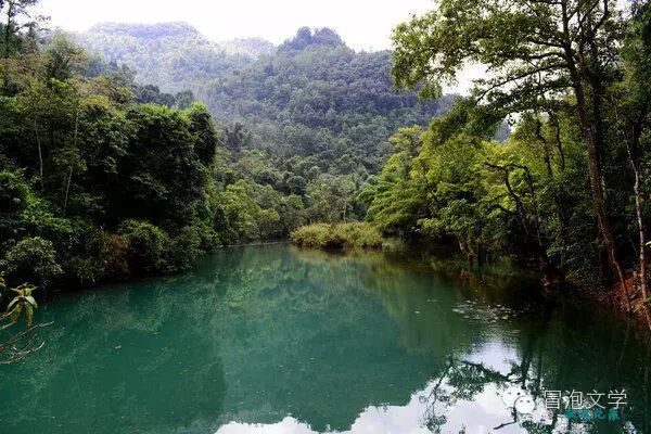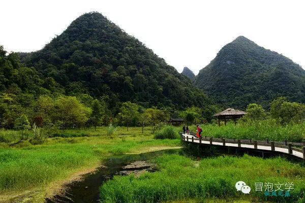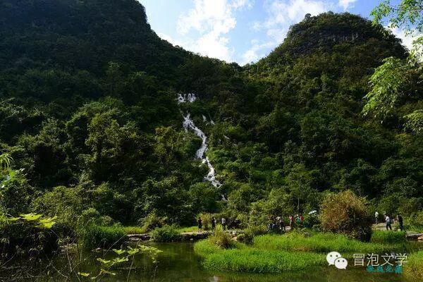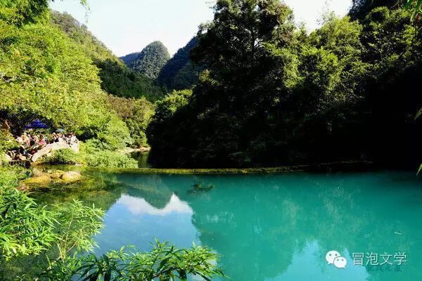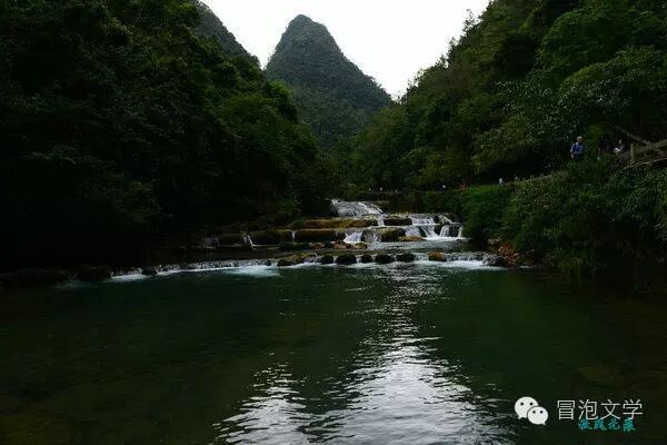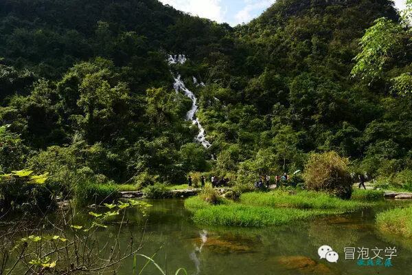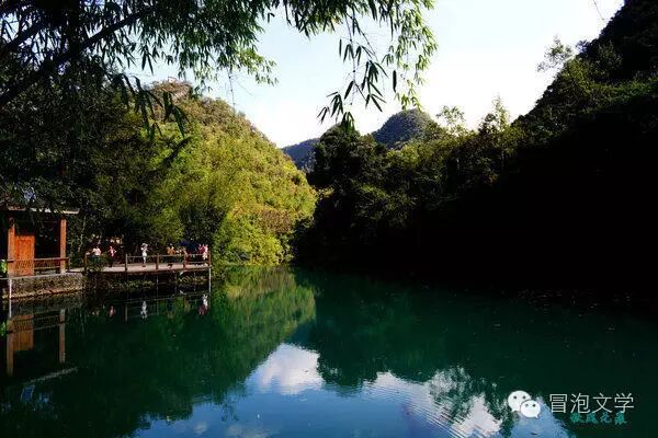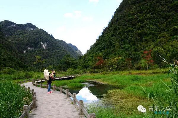 沿着瀑布上行,湿地公园般的翡翠谷,栈道蜿蜒,喀斯特地貌上的草、石,水,将秀美尽情展现,湿地上游,一个清澈的湖面,倒影青山,好一幅柔美南国画卷。