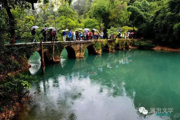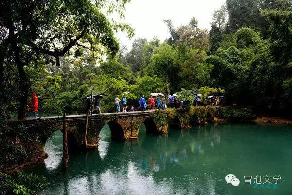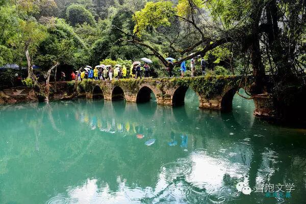 在雨中来到小七孔桥边。太阳雨在继续,游人争相在雨中古桥上留影,雨打碧潭,翡翠的河谷与青藤满身的古桥有了一幅仙境迷幻。