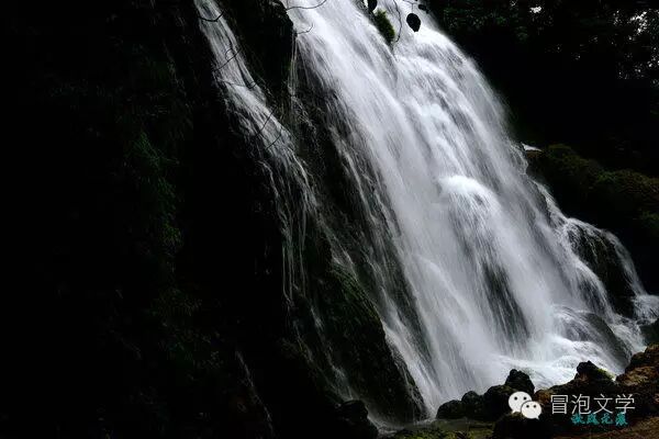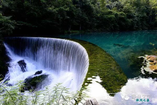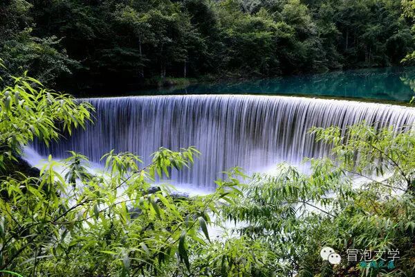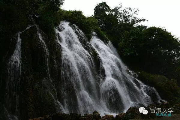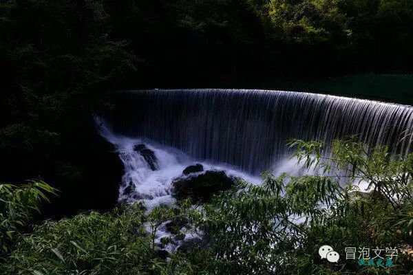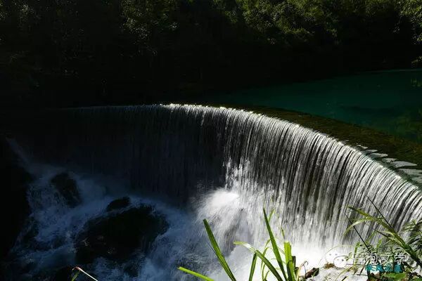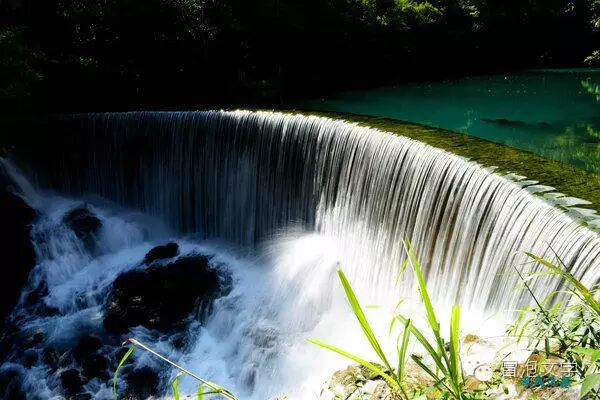 继续乘车上行,来卧龙潭边,一石砌拱形水库前,银珠成练,碧水若翡翠,阳光照射银练、碧潭,多少幻境在其间。