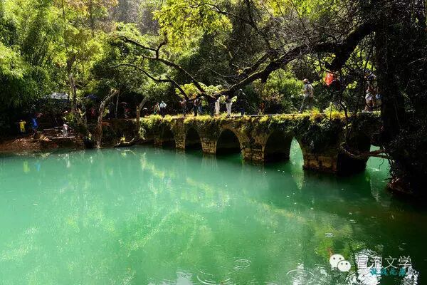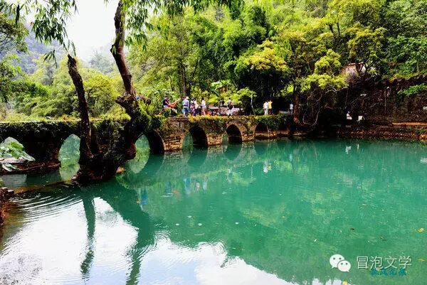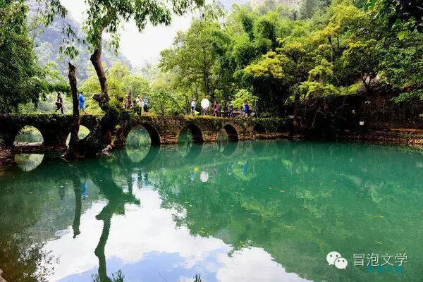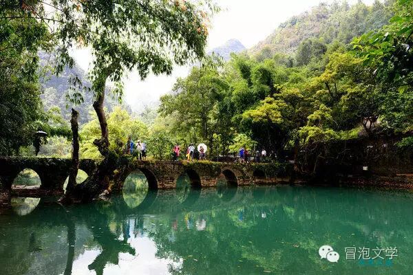 小七孔,这是一座小巧玲珑的七孔古石桥,桥长25米,桥面宽4米,拱高4米,建于清道光15(1836)年,昔为沟通荔波至广西的重要桥梁。桥由麻石条砌成,桥身爬满藤蔓和蕨类;古色古香的桥下是绿得令人心醉的涵碧潭。两岸古木参天,巨大的虬枝沿着桥伸臂,宛如巨伞撑在桥上。